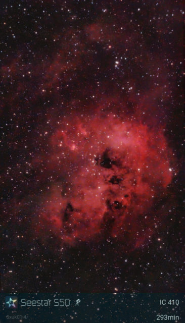 M44 Open Cluster was a mosaic and took a little over 95 minutes to capture (286 x 20 sec.)  The Tadpoles (IC 410) took two nights of imaging and I let the Seestar S50 stack the resulting two sets of sub-images.  It was about 4.88 hrs of exposure.
